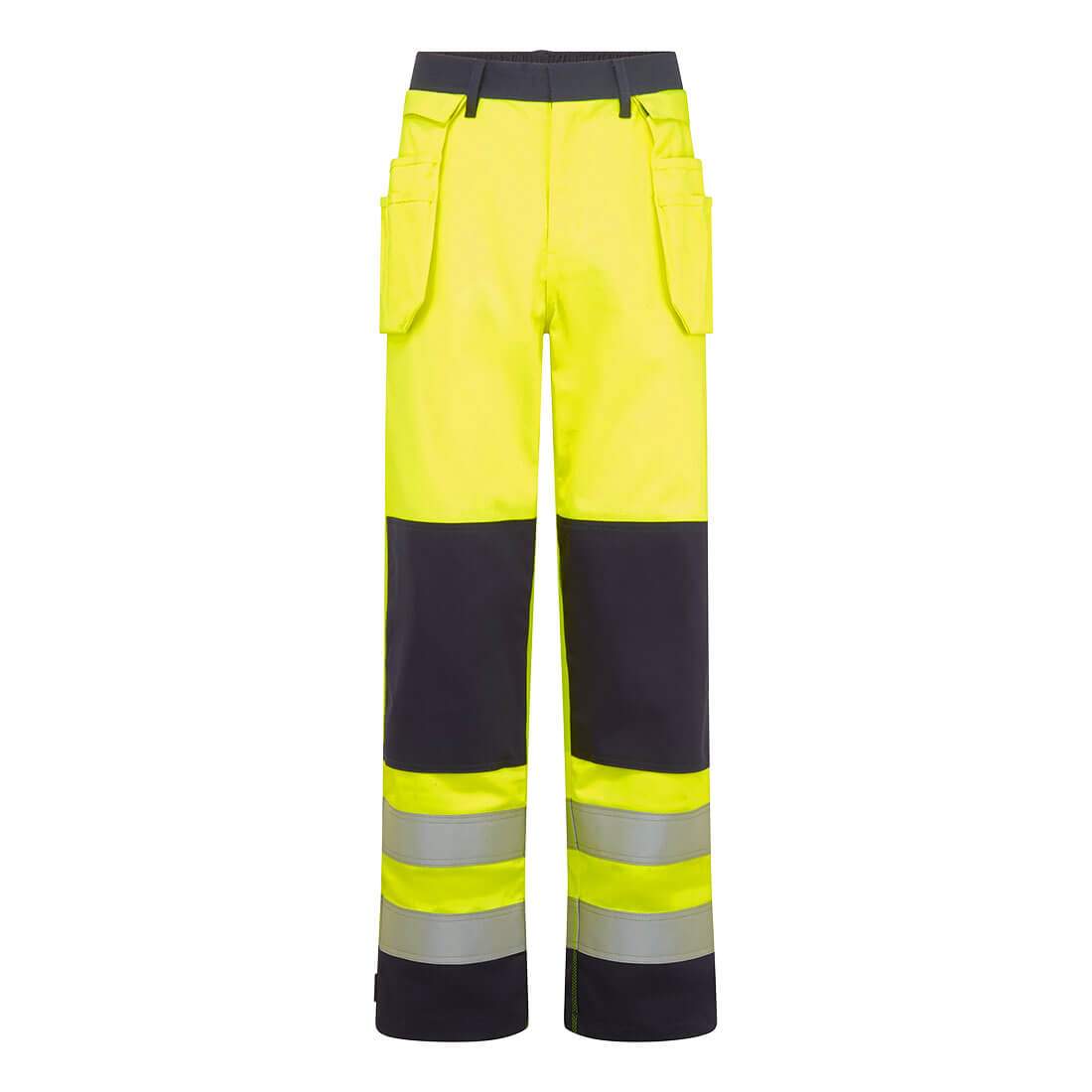 The FR440 Bizflame Work Hi-Vis Contrast FR Holster Trousers are constructed with the highly innovative Bizflame Work HV fabric. It is comfortable protection against multiple risks, including exposure to heat, fire and electrical arcs. These FR trousers feature removable holster pockets, twin-stitched Hi-Vis strips on legs, a front brass zip and two flapped front pockets, one flapped back pocket and a lower tool pocket with flap.