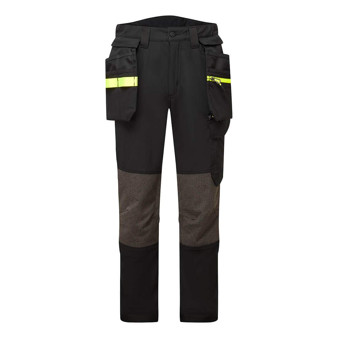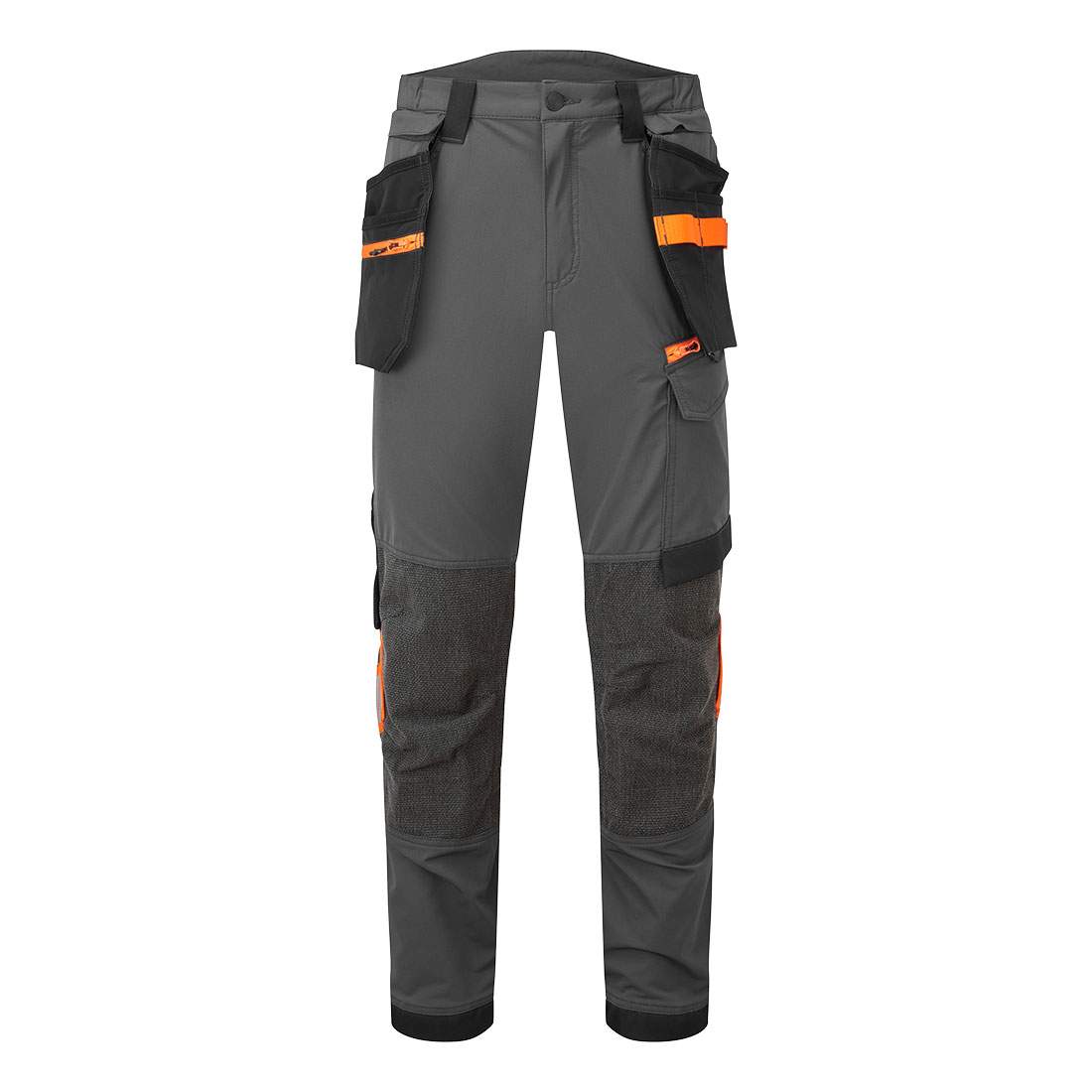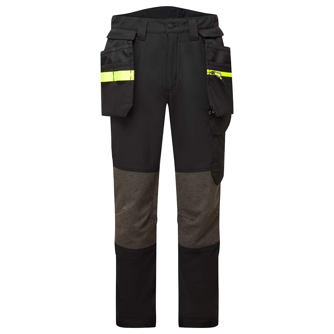 The EV4 Stretch Holster Trouser offers an enhanced ergonomic design, featuring laser cut ventilation for optimal airflow during work. With a high-rise back waistband and side elastication, it provides excellent protection in all working positions. The trousers include pre-bent, side entry adjustable knee pad pockets, spacious front pockets, and versatile zip thigh pockets for secure storage of phones, pens, and tools. Triple stitching throughout ensures maximum durability.