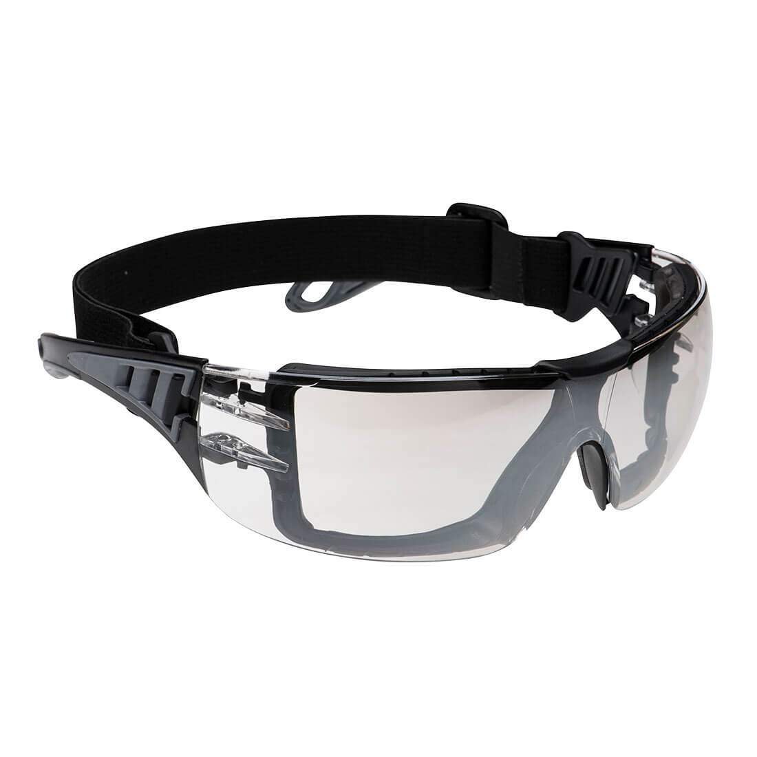Dielectric safety spectacles with metal free hinges features a tough and modern design with dual material on the side arms. The wide elastic band ensures an improved fit and can be easily combined with helmets and ear defenders. The removable EVA foam gasket allows extra comfort and offers additional protection against shocks and dust.