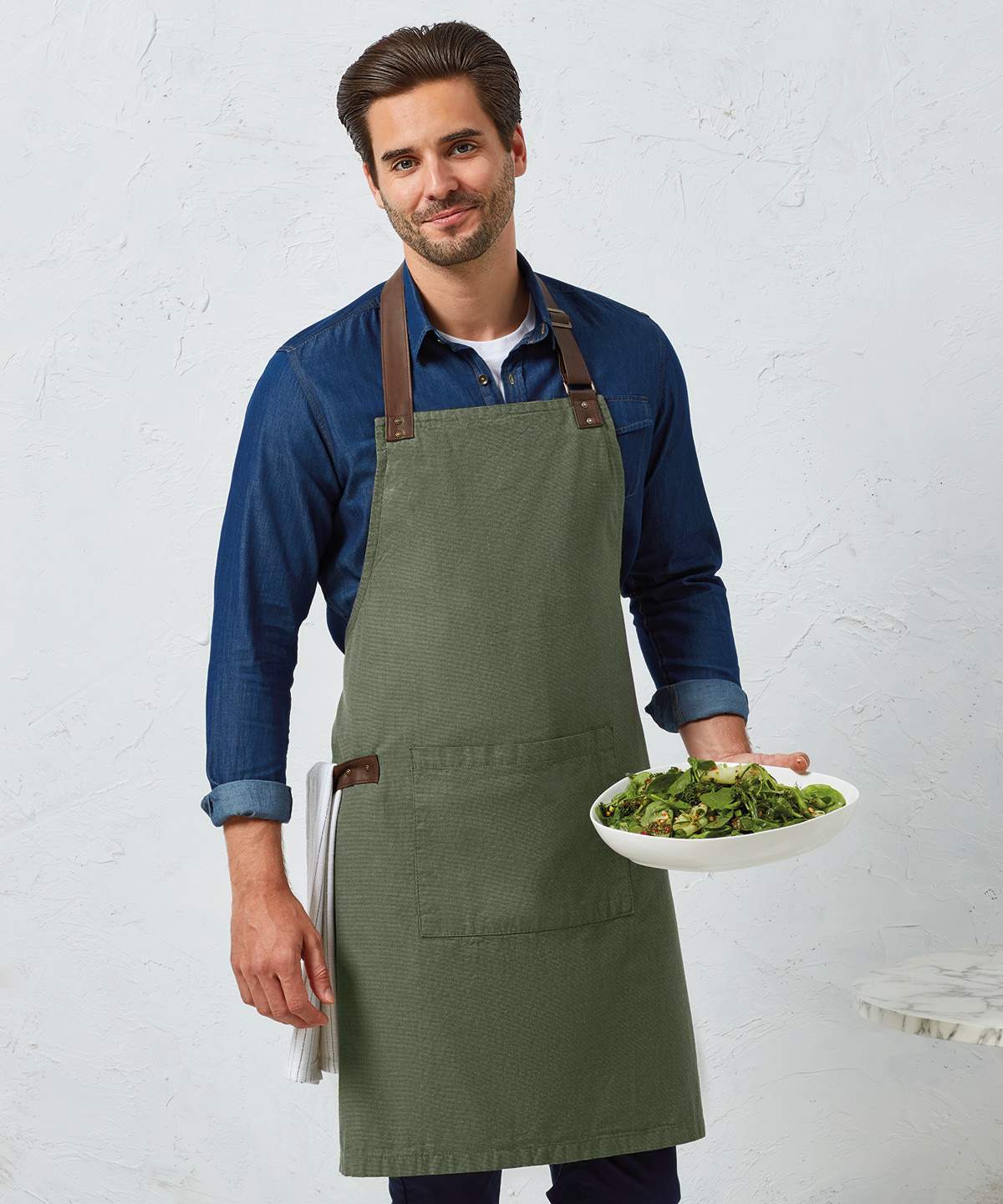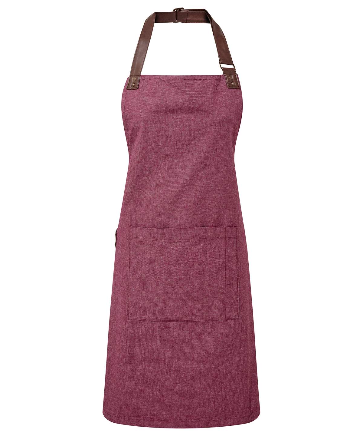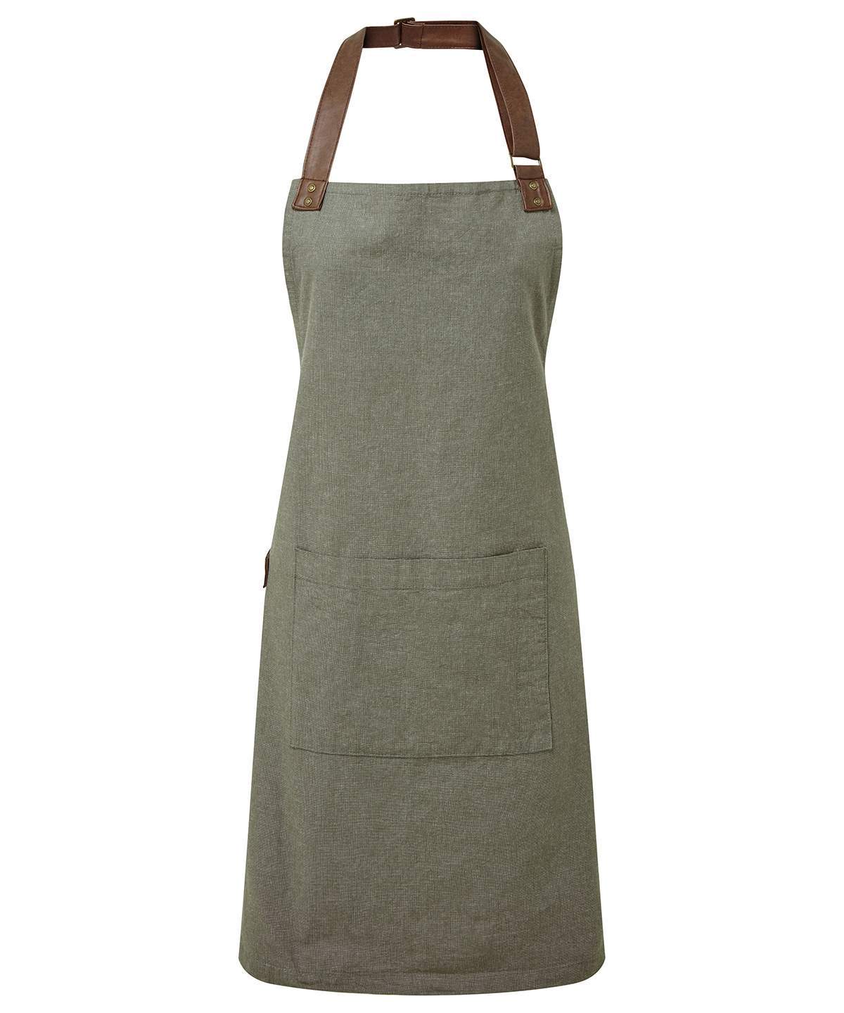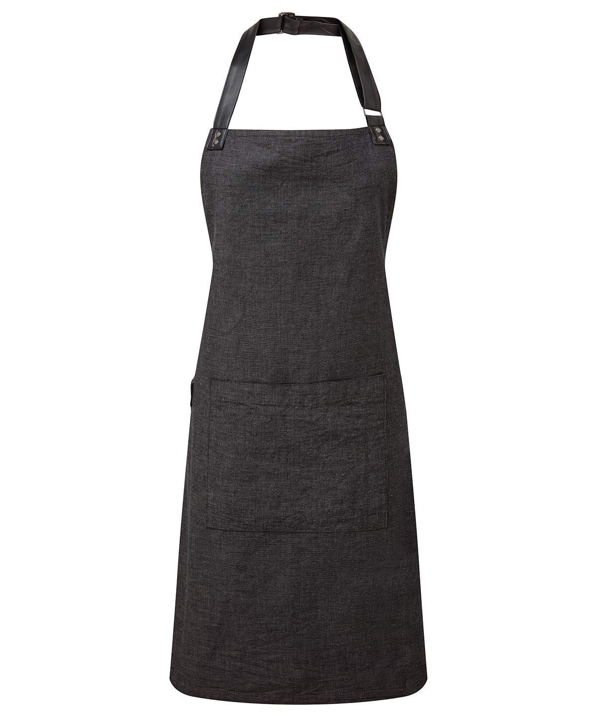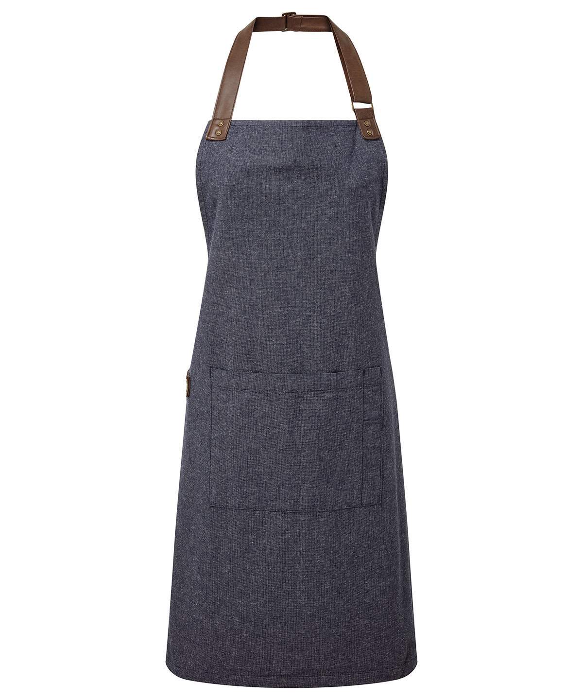 An Attractive Bib Apron Using Yarn Dyed Cotton Threads That Are Woven Together To Create A Pleasing Contrast Effect To The Centre Lies A Tablet Friendly Pocket With Combined Pen Pocket A Self Fabric Tie Can Be Looped Through And Secured In Place Using A Double D Ring At The Waist Faux Leather Fabric Features For Decoration And Practicality Finish Off This Stunning Apron