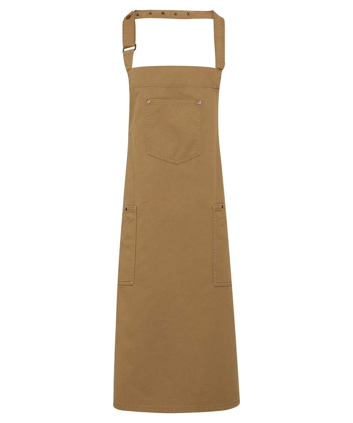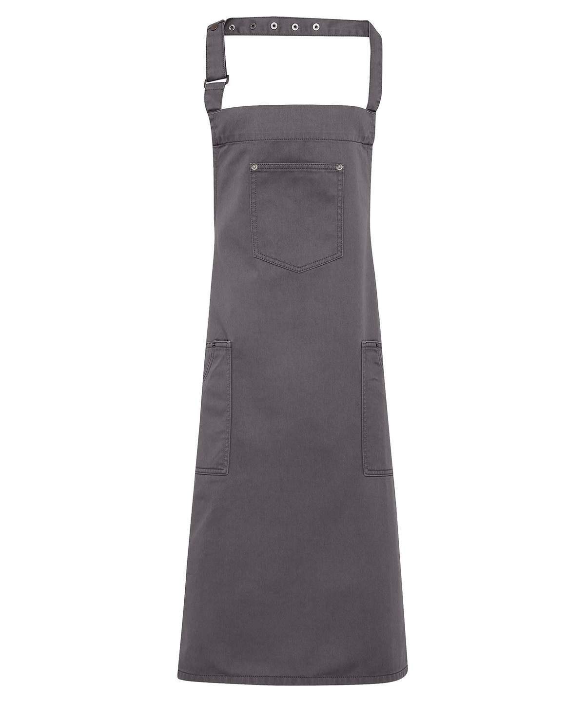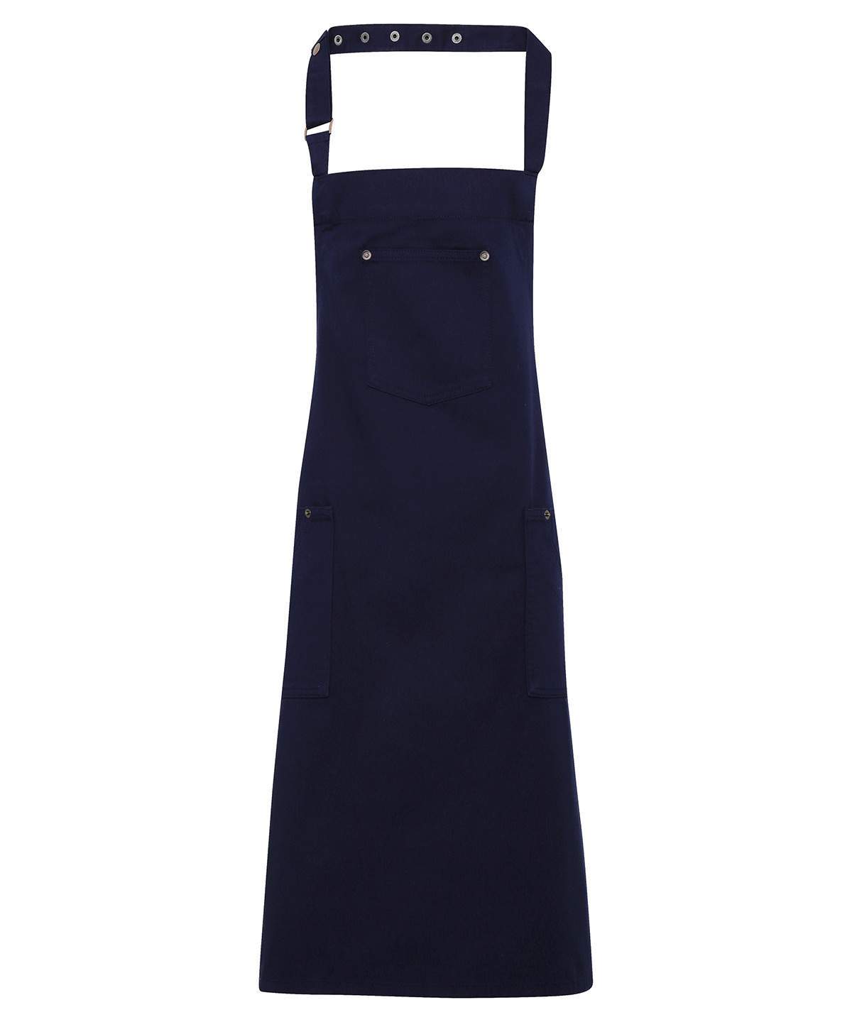This Full Bib Apron Is Designed With Classic Chino Style Accents For A Cool And Edgy Uniform Solution For Bars And Restaurants There Are Three Functional Pockets For Design And Practicality Together With A Simply Pop Snap Button Fastener To Secure The Neckband In Place