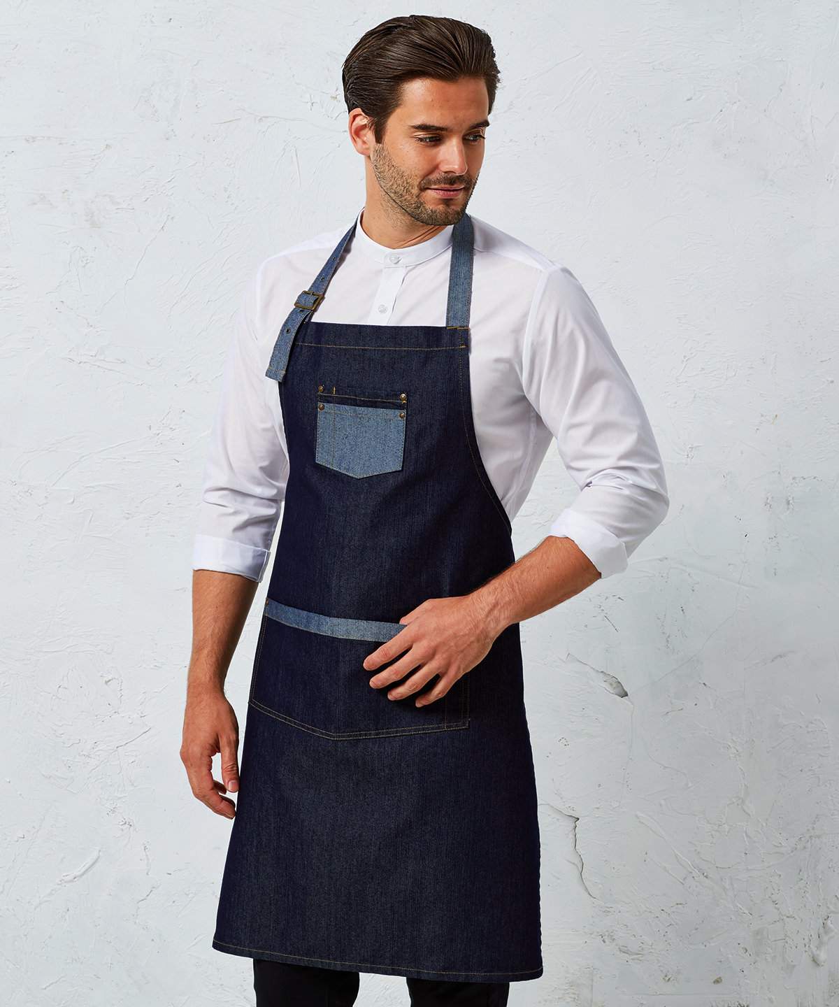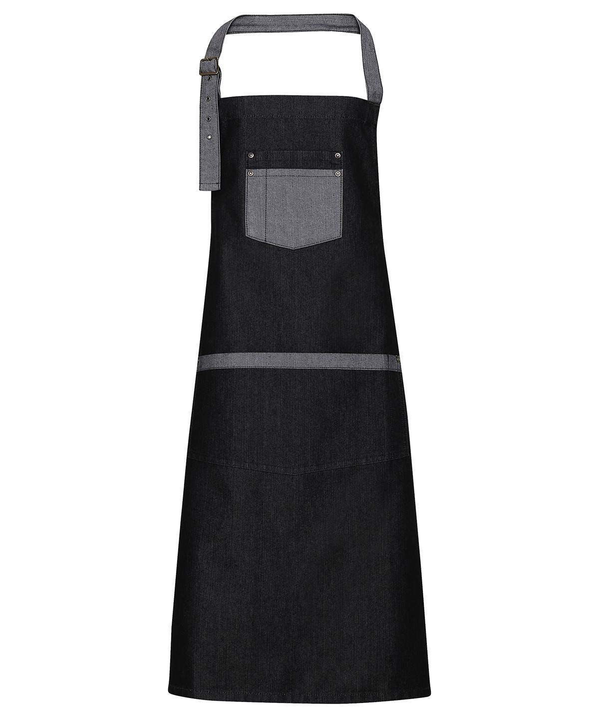 A Quirky Addition To The Denim Range This Bib Apron Gives An Industrial Chic Feel To Service With Large Gun Metal Eyelets Securing The Ties In Place The Shade On The Underside Forms The Contrast Trim Detail On The Pocket And Ties For A Great Reversible Effect