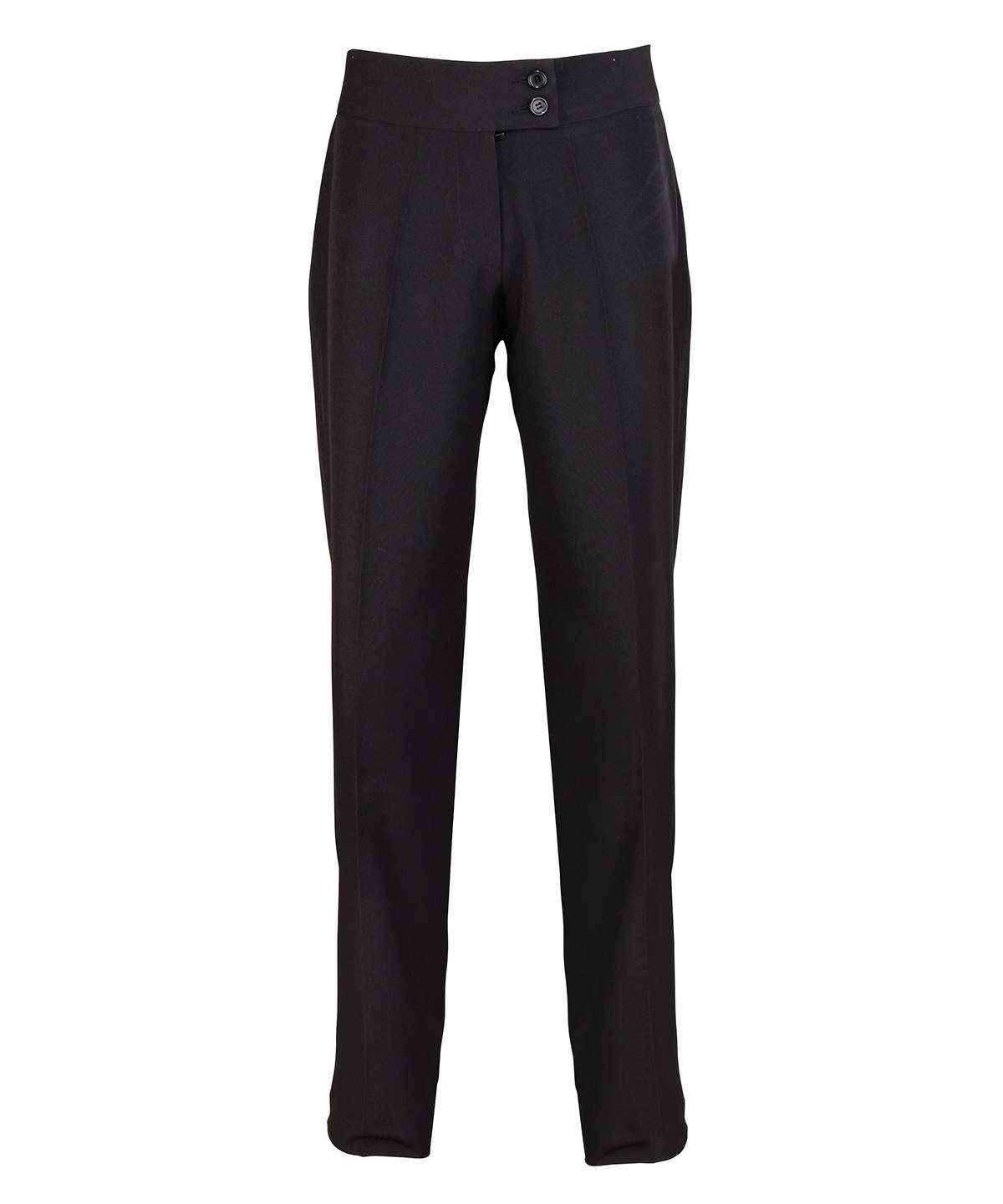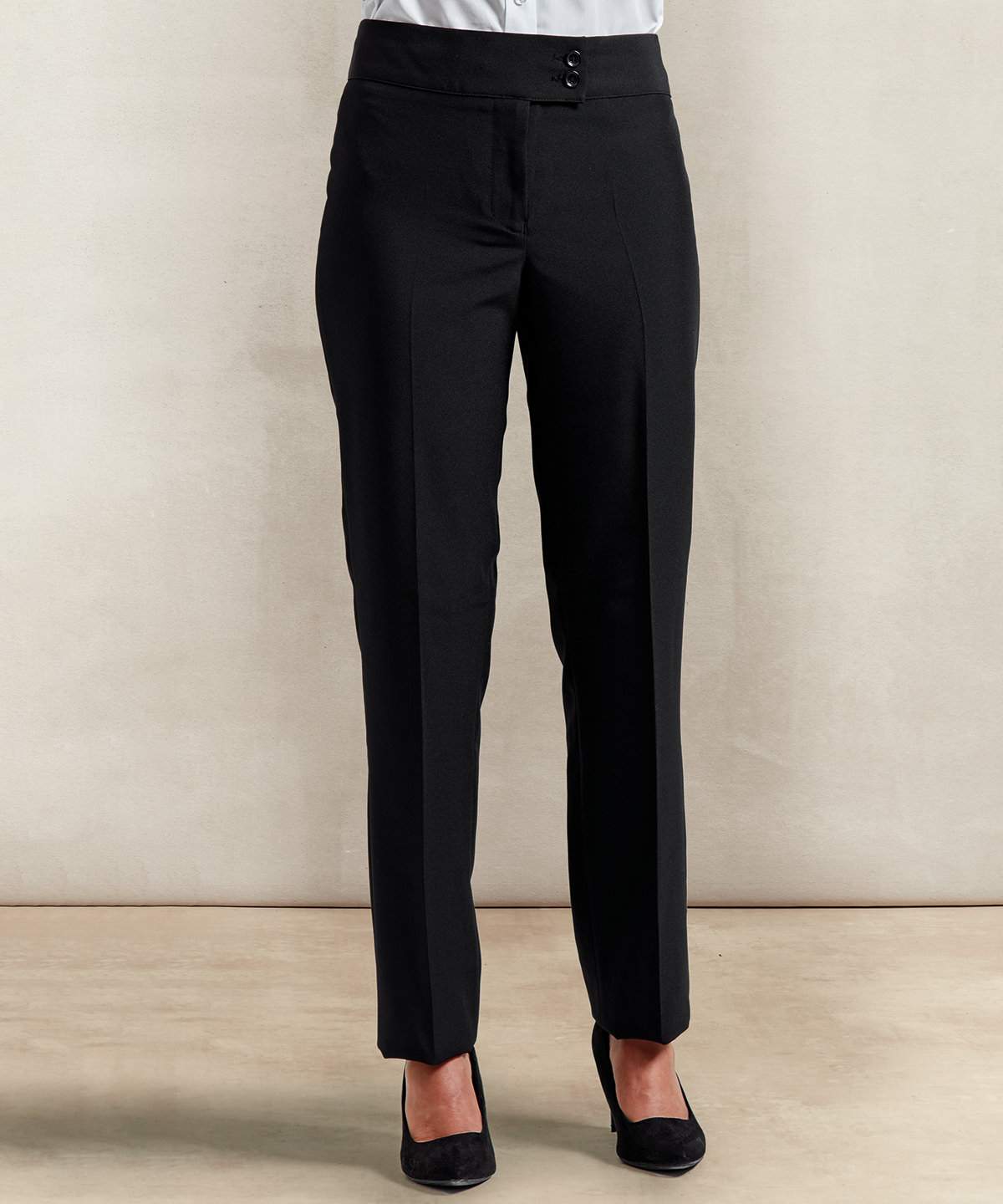 A Straight Leg Trouser For Women That Features A Deep Waistband With Cross Over Tab And With Two Button Fastening Available In Two Leg Lengths And Four Colours This Is Great All Round Uniform Trouser For Women
