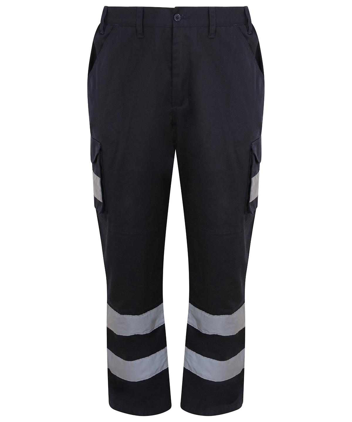 The high visibility cargo trouser perfectly completes your workwear needs. Made from a durable polycotton fabric with water-repellent finish. Available in high visibility yellow and orange with contrast navy hem providing level 1 protection and in solid navy for times where less protection is required.
