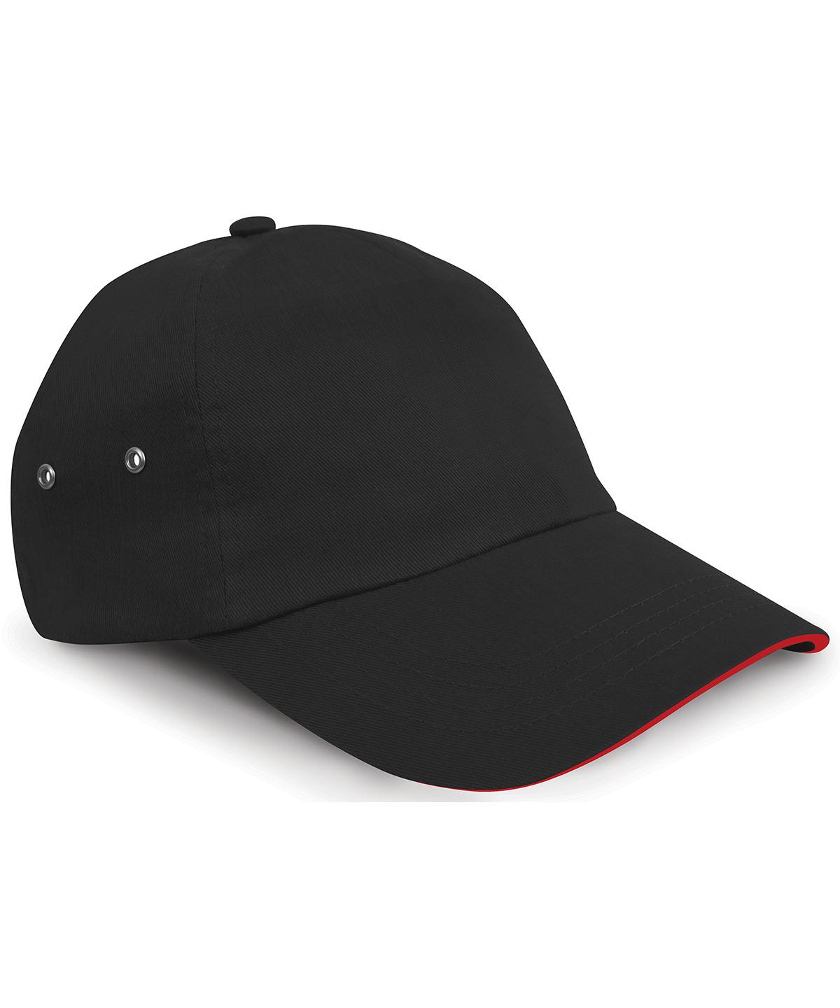 Plush cotton printers cap, ultimate 5-panel low profile cap, contrasting colour sandwich peak and fabric size adjuster with brushed metal buckle.