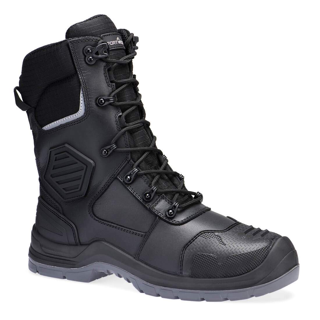High boot with a lightweight composite S7L construction, including an inside leg zip fastener, water resistant leather with a waterproof and breathable membrane to keep feet dry and comfortable in the harshest of conditions. The upper incorporates non-metallic metatarsal protection as well as a tough, durable scuff cap, counter and ankle protection zones. Insulated for cold and hot environments. This boot also features a dual density PU/Rubber heat resistant outsole complete with certified ladder grip as well as rigid reinforcement in the sole arch to provide added support whilst digging.
