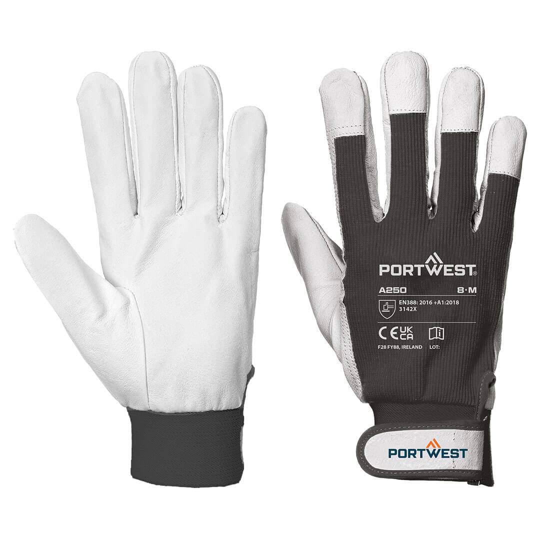 Durable goat grain leather glove with hook & loop fastening, cotton back and reinforced fingertips. Suitable for light industrial applications.