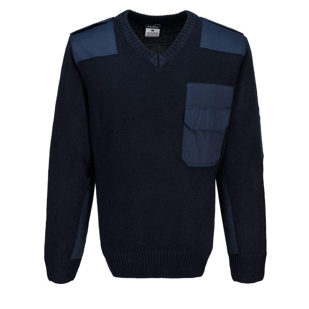 A long time favourite with the public services, this 100% acrylic sweater has polyester cotton shoulder and elbow patches for extra reinforcement. Features include Hook & Loop fastening shoulder epaulette and a sleeve pen pocket.